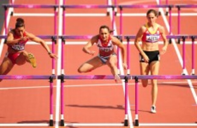 Jessica Ennis, centre, on her way to winning heat 5 of the Women's Heptathlon 100m Hurdles. Adam Davy/PA Wire