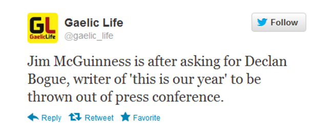 Declan Bogue of the Belfast Telegraph was then informed by GAA press officer Siobhan Brady that McGuinness would not return while he remained present. Bogue agreed to leave and McGuinness soon came back in.
