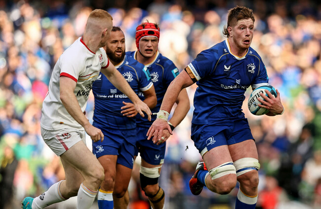 Josh van der Flier gives him the opportunity with a superb chop tackle on Ulster back row Matty Rea, getting him to ground very quickly.
