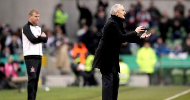 Cork City manager John Caulfield issuing instructions to his players during last November's FAI Cup final, while Dundalk boss Stephen Kenny looks on. Ryan Byrne/INPHO