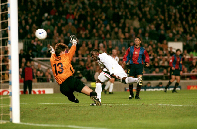 Dwight Yorke scores to put Manchester United 3-2 ahead at the Camp Nou in November, 1998. Michael Steele