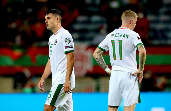Ireland's John Egan (left) shows his disappointment after the game. Ryan Byrne/INPHO