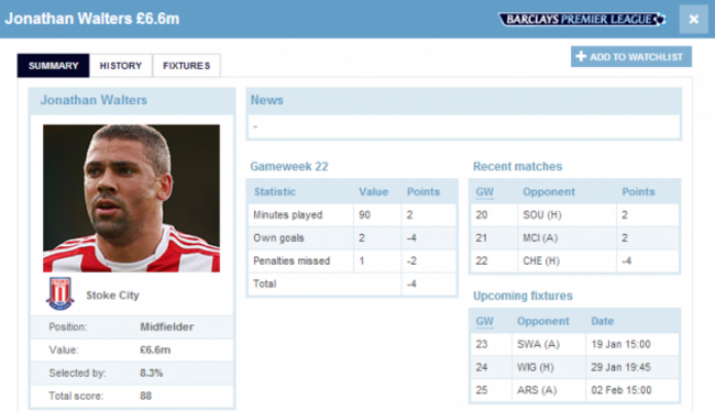 Fantasy Football FF Jon Walters Negative Equity Premier League Stoke