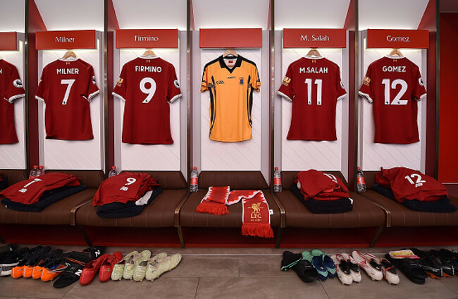 The St Peter's Dunboyne GAA jersey hangs in the home dressing room at Anfield. Andrew Powell