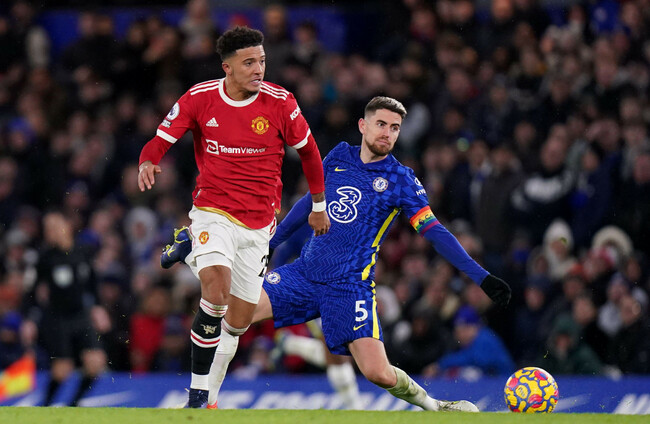 Jadon Sancho gets away from Jorginho before putting Manchester United ahead against Chelsea. Alamy Stock Photo