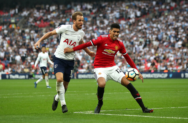 Smalling protects the football from Harry Kane. Nick Potts/PA Images
