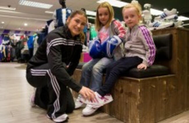 adidas ambassador Katie Taylor pictured with Seren Evans, 5, and Éamha Ledwith, 5, in the newly refitted Life Style Sports store at Dundrum Town Centre. Sportsfile