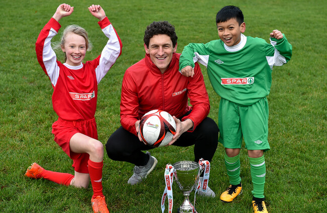 Andrews at the launch of the SPAR FAI Primary School 5s Programme with students from Scoil Mhuire CBS and St Vincent de Paul’s Girls NS today. Seb Daly/SPORTSFILE