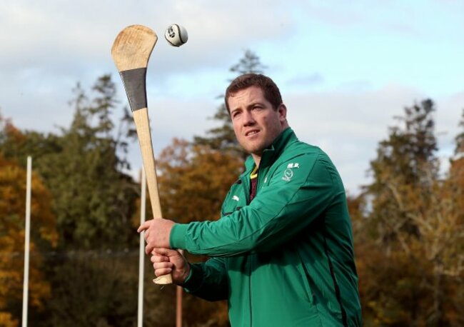 Michael Bent practices his hurling skills at Ireland’s training camp. (©INPHO/Dan Sheridan)