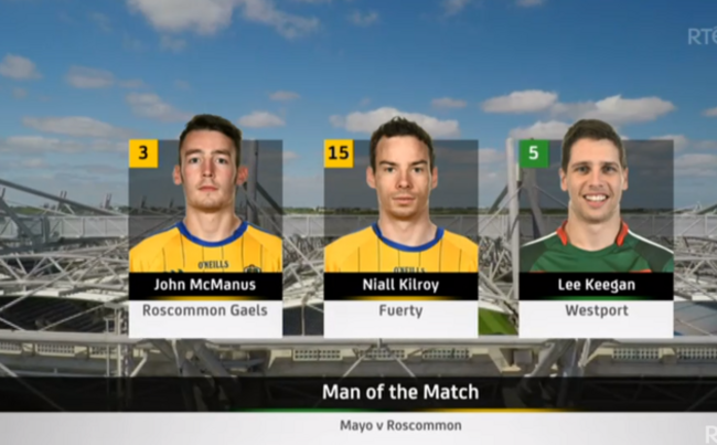 Following the Mayo-Roscommon stalemate, winner Keegan was nominated alongside Roscommon pair John McManus and Niall Kilroy: