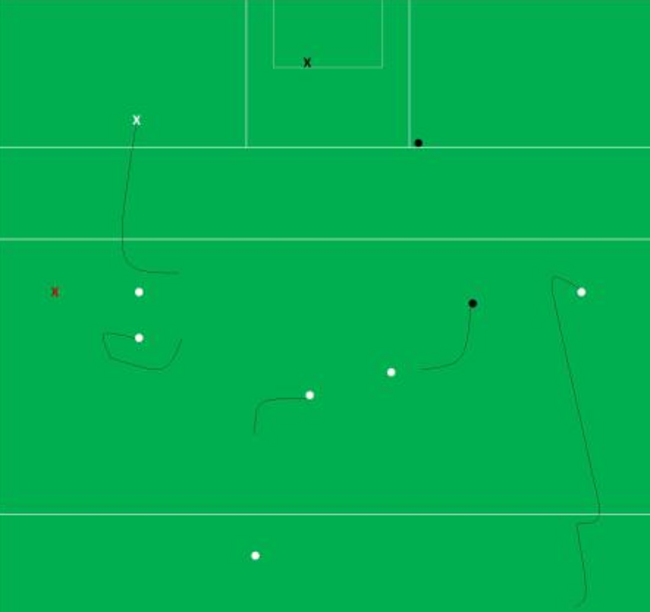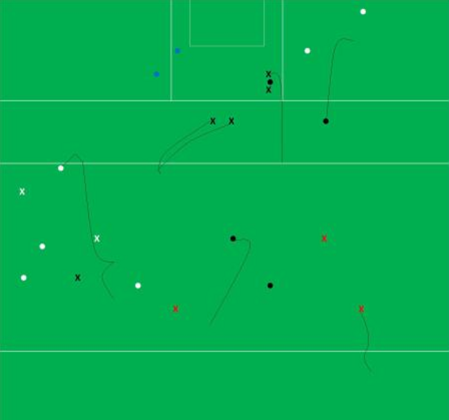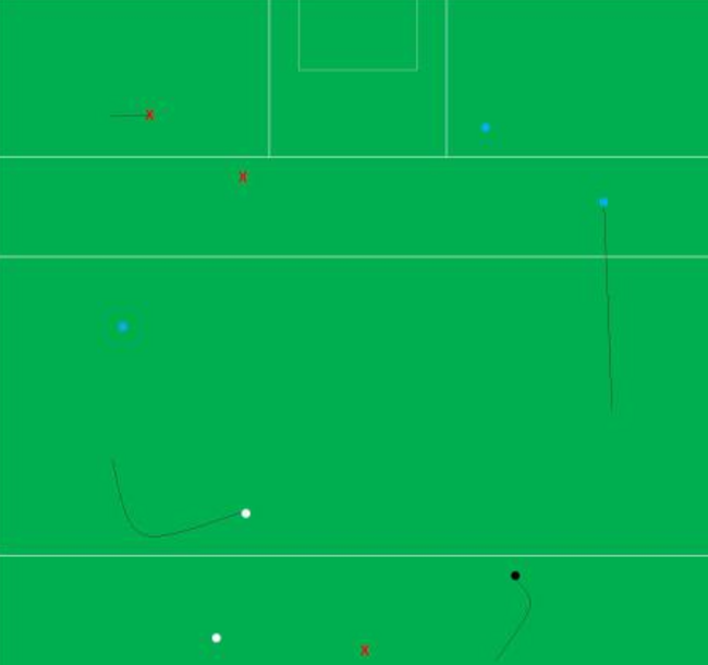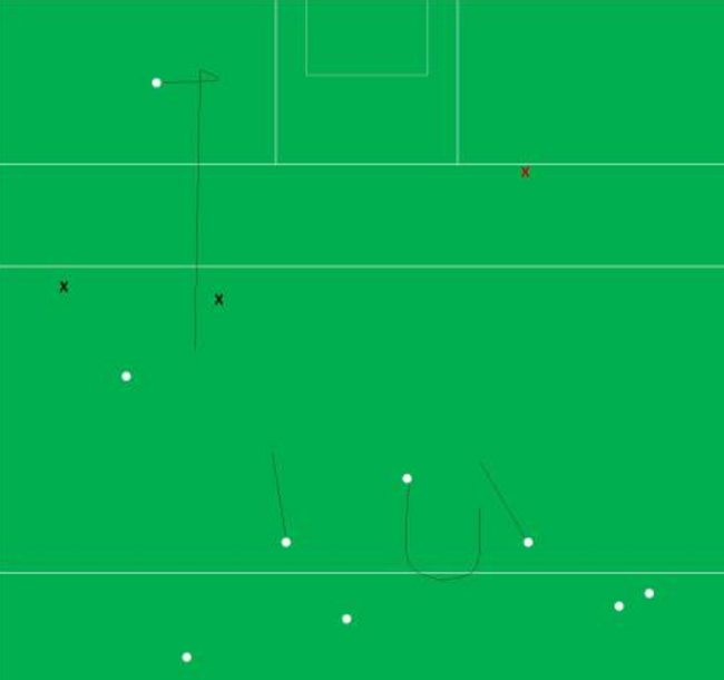 white = pass, black = shot from play, red = dispossessed, blue = fouled (same for all subsequent charts)