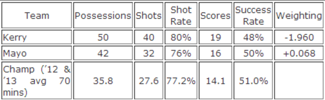Over the 90 minutes Kerry just had too many attacks for Mayo. It was Mayo’s efficiency in normal time that produced Extra Time (84% Shot Rate and 54% Success Rate in 70 minutes) but they were always relying on eking the most out of minimal attacking ball.