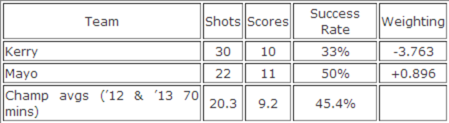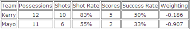 After praising Kerry’s shooting from play the last day they throw in an absolute stinker. That is a very un-Kerry like stat line. In three Championship games prior to this one Kerry’s combined Success Rate from play was 62.4% with a weighting of +13.178. They had been imperious – and had hit 63% against the same defence six days previously.