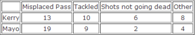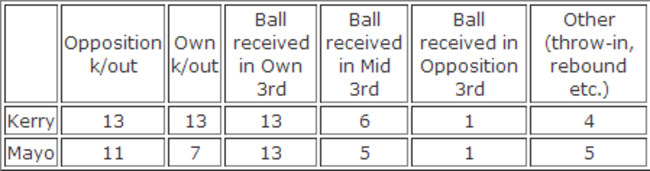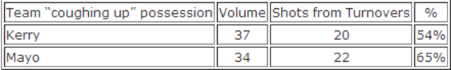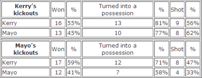 Kerry managed 5 more shots from the kickouts they won. This was not through a better use of the ball, as their kickouts won to shot percentage is very similar to Mayo, but rather due to the sheer volume of kickouts won (+8 overall).