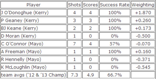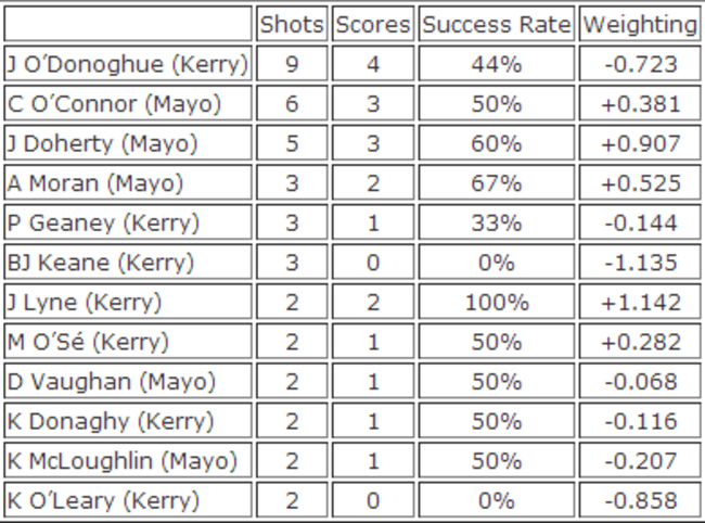 O’Connor’s returns may appear poor, given his status as a supreme marksman from deadballs, but again the success rate and weighting are negatively affected by his attempt at a goal with Mayo’s last shot at the end of extra time. Remove this and his returns are basically average (success rate of 67%, weighting +0.338).
