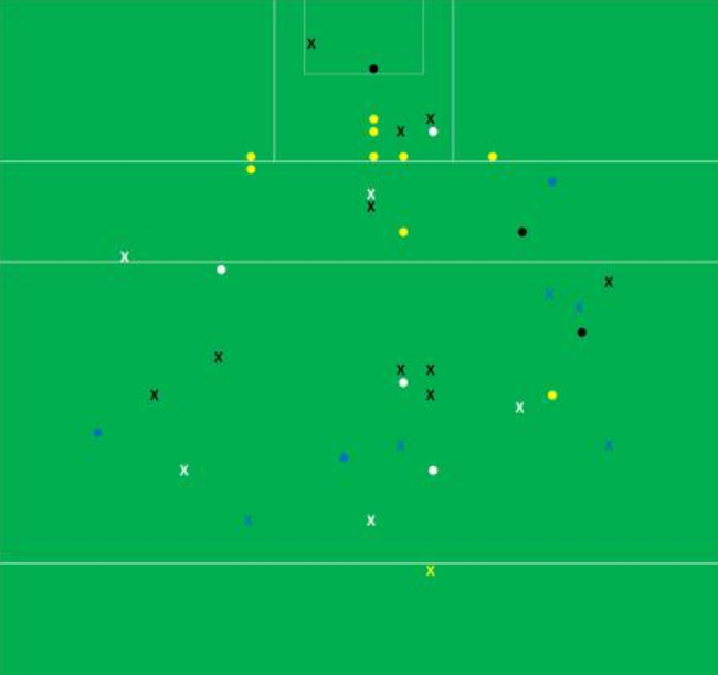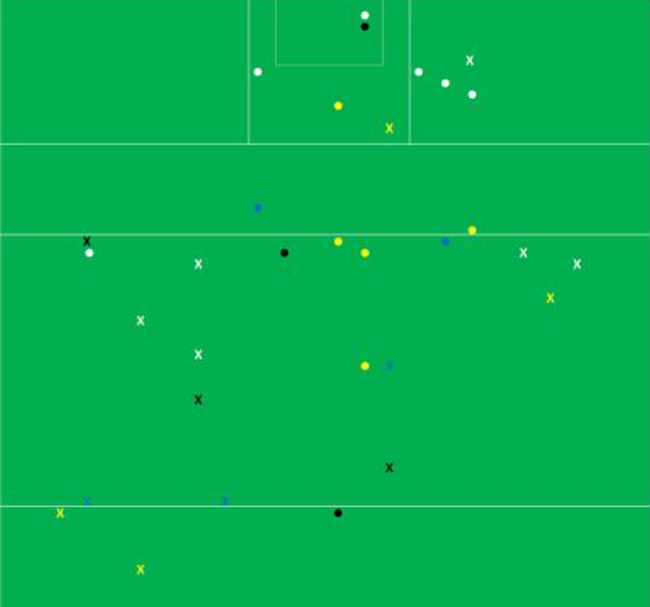 x = missed, disc = score, yellow = deadball, black = 1st half from play, white = 2nd half from play, blue = extra time