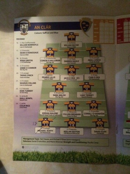 Here’s a better view of the Clare team, it appears that there is one late change, with Sean O’Donoghue coming in for Michael Duffy at corner forward.