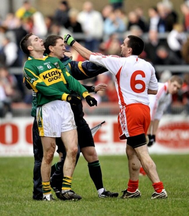 The game ended with a melee close to the touchline and Kerry boss Jack O’Connor remonstrated with Tyrone’s Ryan McMenamin.