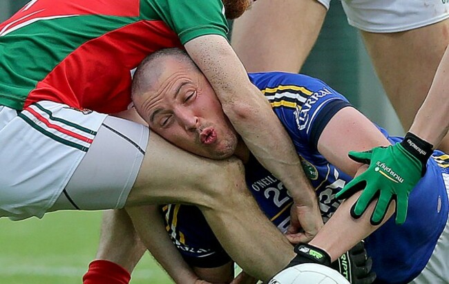 Tight fit as Donaghy is pressured by the Mayo defence Donall Farmer / INPHO Donall Farmer / INPHO / INPHO