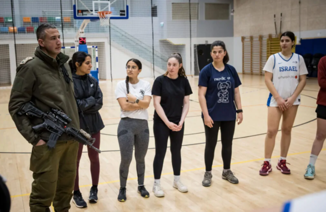 Photos were published online this week of the Israeli team posing with armed members of the Israeli Defence Forces at a sports hall in Tel Aviv.