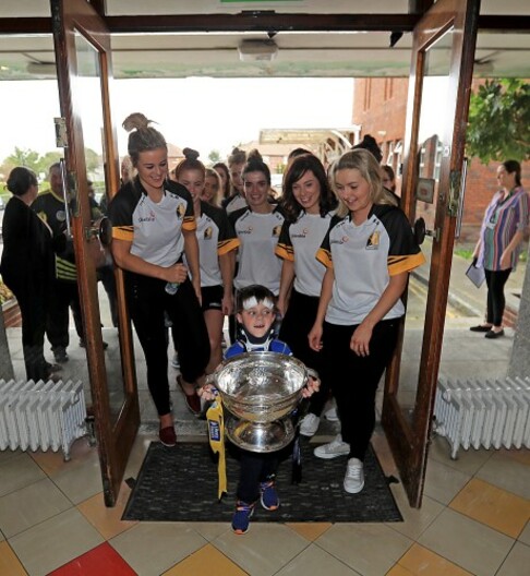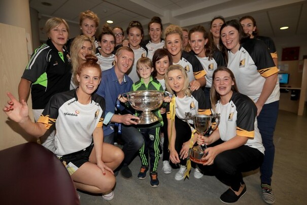 Henry Shefflin Junior along with his father Henry with Kilkenny senior camogie players and Ann Downey