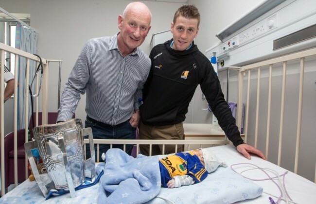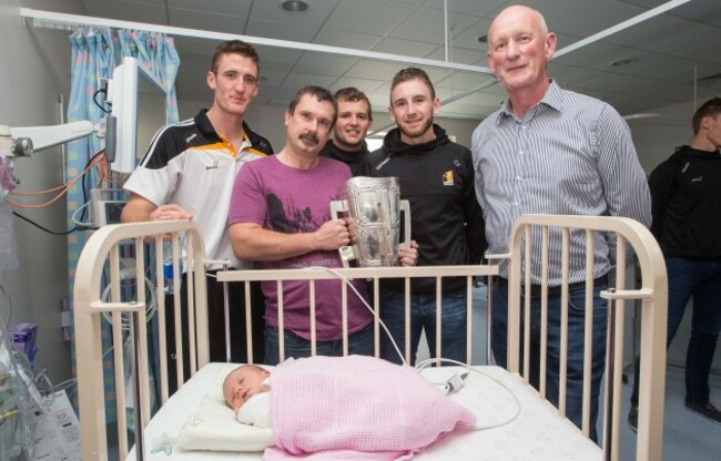 2. Colin Fennelly, Padraig Walsh, Conor Fogarty and Brian Cody meet Aoife Baumann (5 days old) and her father Hans Baumann from Midleton, Cork