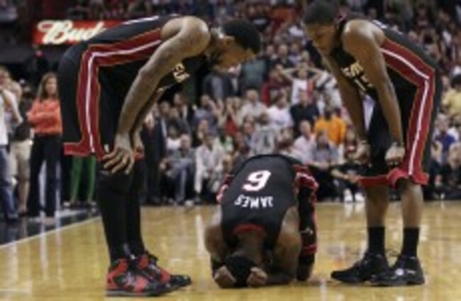Miami Heat's Udonis Haslem, left, and Mario Chalmers, right, check on teammate LeBron James. J Pat Carter/AP/Press Association Images