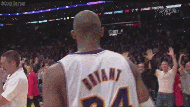 Kobe saved his best for last, scoring the Lakers’ final six points, including a monster drunk that reminded many of a much younger Kobe. After the game, Kobe celebrated the game in the most Hollywood way possible, by high-fiving Jeremy Piven (see GIF below). Here’s the dunk (via Sportsnet)…