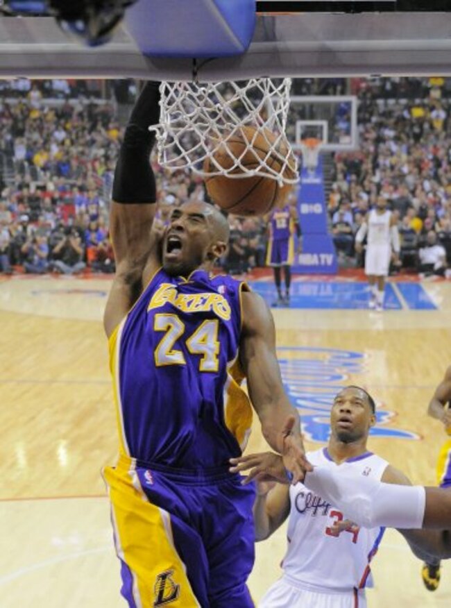 Bryant deposits a dunk. (AP Photo/Mark J. Terrill)