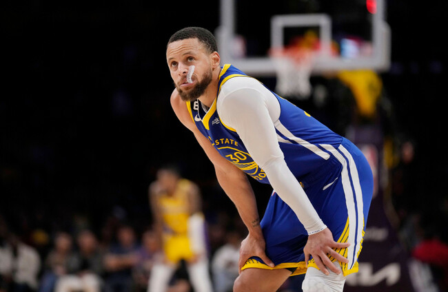 Golden State Warriors guard Stephen Curry stands on the court in at the closing minutes of a loss to the Los Angeles Lakers. Alamy Stock Photo