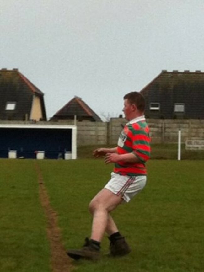 Thanks to Brian Mulvihill who sent us this image of one local GAA star playing for Tracton versus Kinsale in the Carrigdhoun (South-East) Junior B football league in Cork last night. Great stuff.
