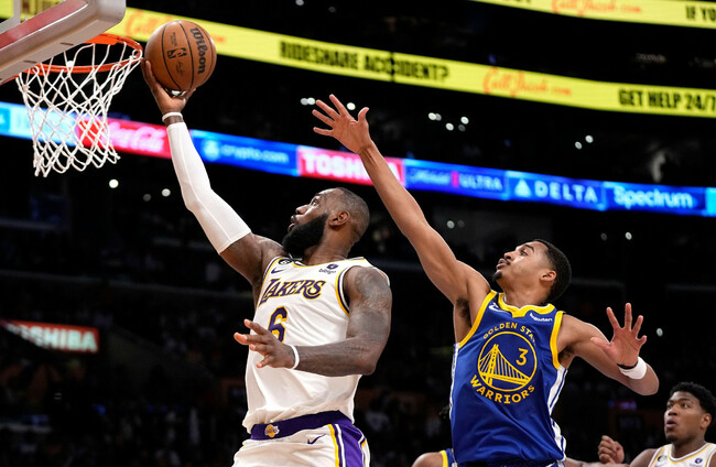 Los Angeles Lakers forward LeBron James, left, shoots as Golden State Warriors guard Jordan Poole defends during the first half in Game 3. Alamy Stock Photo