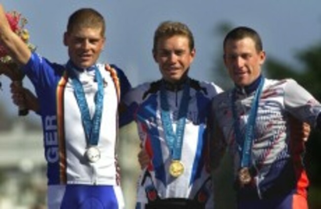 Gold medallist Viacheslav Ekimov of Russia, centre, with silver medal winner Jan Ullrich, left, and Armstrong. Laurent Rebours/AP/Press Association Images