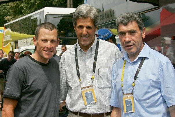Visiting Democratic Sen. John Kerry with Armstrong and Belgian cycling legend Eddy Merckx