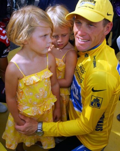 Armstrong with his twin daughters Grace, left, and Isabelle after winning his 7th straight Tour de France
