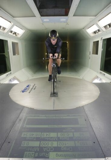 Armstrong warms up before riding a Trek prototype bicycle at the Low Speed Wind Tunnel in San Diego