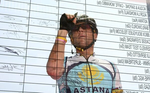Armstrong signs on before a Giro d'Italia stage