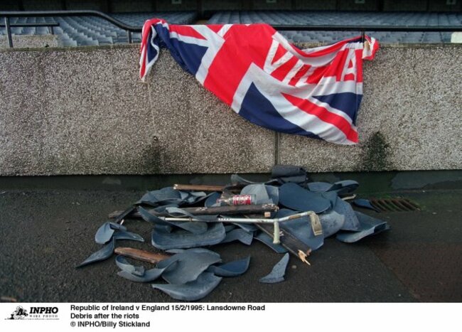 THIS WEEK MARKS 20 years since the famous meeting of Ireland and England at Lansdowne Road. The international friendly last just 27 minutes. The rioting of some travelling fans in the old ground as Jack Charlton’s side led 1-0 in Dublin saw Dutch referee Dick Jol call time on the match. Players, fans, media and officials were left watching missiles rain down from the upper tier.