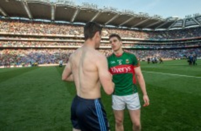 Lee Keegan and Diarmuid Connolly shake hands after last Saturday's replay. James Crombie/INPHO