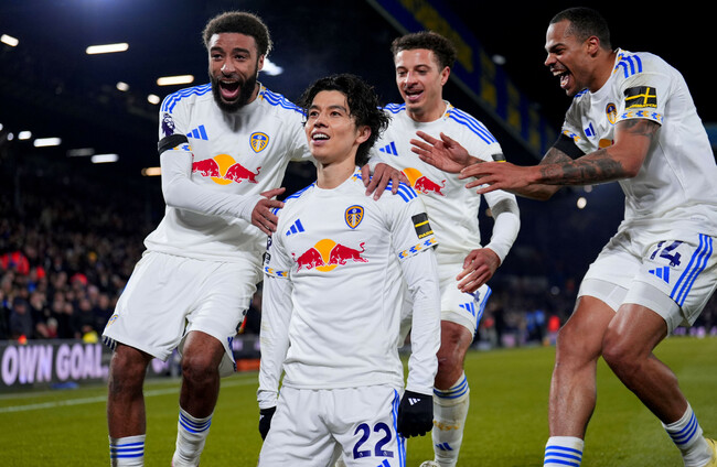 Leeds United's Ao Tanaka (second left) celebrates after scoring his side's second goal. Alamy.