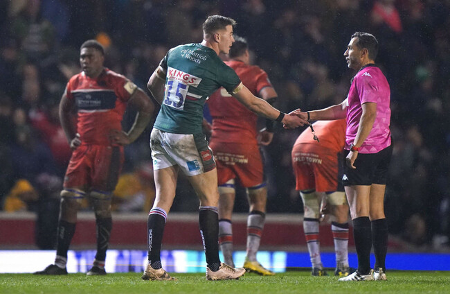 Leicester Tiger's Freddie Steward shakes hands with the referee after the final whistle in the Heineken Champions Cup round of sixteen match. Alamy Stock Photo