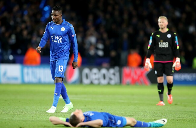 Leicester City's Daniel Amartey (left), Kasper Schmeichel (left) and Jamie Vardy after the second leg of the UEFA Champions League quarter final match at the King Power Stadium. Nick Potts