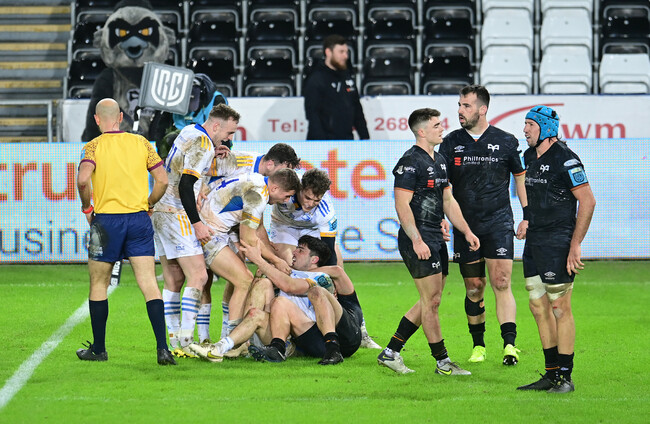 The game really started for the home side when they had the chance to attack the first Leinster scrum just inside the visitors’ half. Fielding what could even be the first-choice Welsh front row, the combined efforts of Nicky Smith, Dewi Lake and Tomos Francis sent the Leinster trio back and then up, Michael Ala’alatoa almost going into orbit.