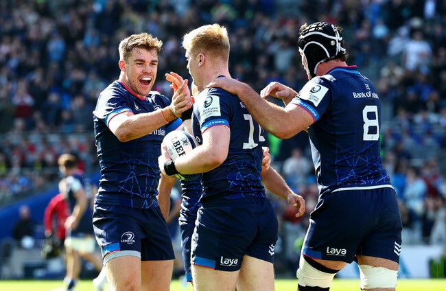 Leinster's Ross Byrne, Jamie Osborne and Jordie Barrett celebrate a try. Morgan Treacy / INPHO