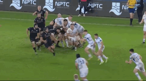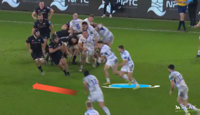 They’re keen to preserve space in the shortside for the second phase of this attack, so we see Ngatai arcing his line infield to run directly at Ospreys out-half Jack Walsh, a collision he’s nearly always going to win.