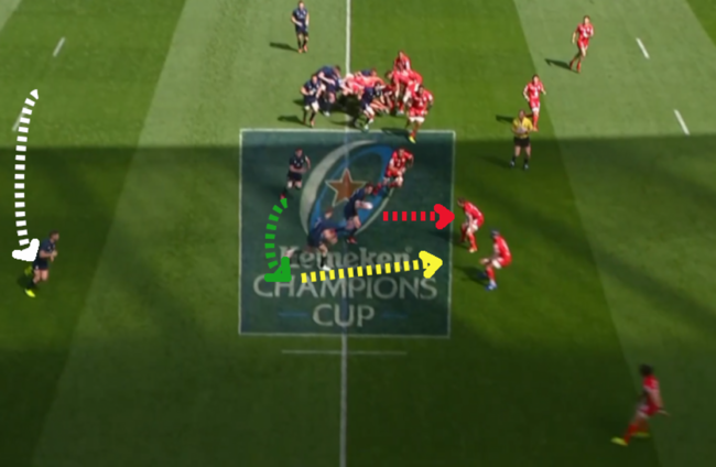 As we can see above, Leinster split their backline on either side of the scrum, forcing Toulouse to do the same.