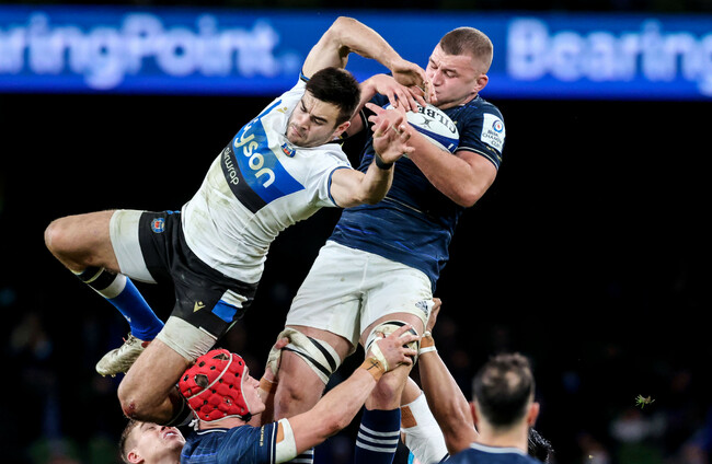 Garry Ringrose and Josh van der Flier in the air with Bath's Will Muir. James Crombie / INPHO
