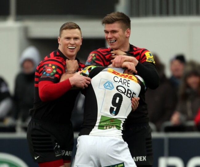 Chris Ashton and Owen Farrell josh Harlequins scrumhalf Danny Care. (David Davies/PA Wire.)