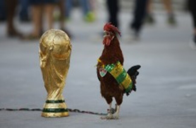 A pet rooster named Paquita Fred stands next to a replica of the World Cup trophy in front of Maracana stadium, in Rio de Janeiro yesterday. AP/Press Association Images