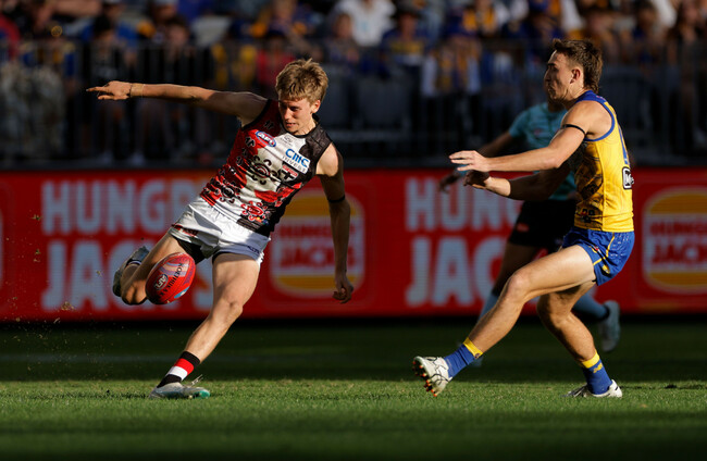 Liam O'Connell kicks the ball during an AFL Round 10 match between West Coast Eagles and St Kilda. Alamy Stock Photo